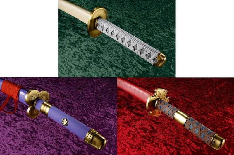 Wado Ichimonji, Sandai Kitetsu et Enma sont des répliques officielles à l'échelle 1/1. Wado Ichimonji comprend un ensemble de pièces de préhension interchangeables qui vous permettent de le tenir dans votre bouche afin de recréer le style de combat à trois épées de Roronoa Zoro.